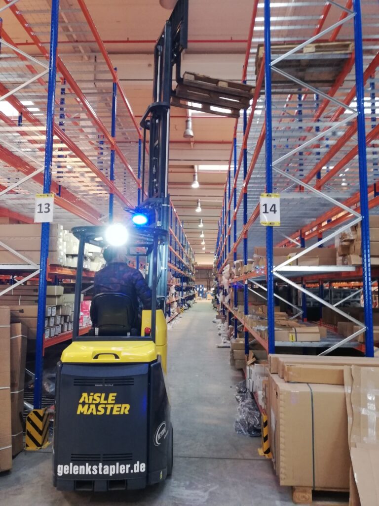 Warum sollen Sie sich für einen Aisle-Master und warum für einen Gelenkstapler entscheiden? Das Prinzip des Aisle-Master Gelenkstaplers ist ganz einfach: Zuerst einmal ersetzt er eine Reihe von verschiedenen Gabelstaplern für effizientere Be- und Entladung, Handhabung und Lagerung. Er funktionert als Gegengewichtstapler indem er Ladungen im Außenbereich entlädt und sie direkt in die Regale in der Lagerhalle bringt. Zweitens bietet der Schmalgangeinsatz – in Gängen von lediglich1.8 m – maximale Ausnutzung Ihrer Lagerkapzität; ob in Ihren jetzigen oder zukünftigen Räumlichkeiten.