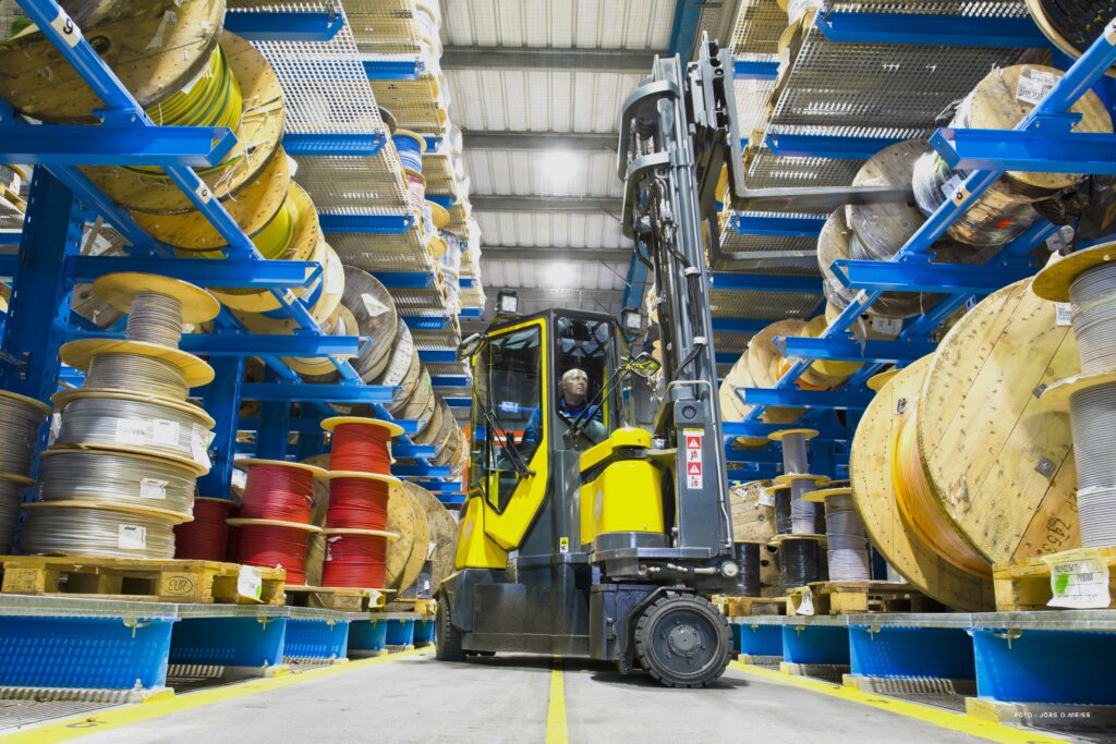 Betrachtet man die Leistungsfähigkeit eines Lagers, hat der Einsatz von Gabelstaplern jedoch einen erheblichen Nachteil: Der große Wendekreis eines Gabelstaplers erfordert viel Platz, um zwischen den Lagerregalen zu manövrieren, wodurch eine Menge an kostbarer Fläche verloren geht. Der dreirädrige Gabelstapler ist kompakter und wendiger als die vierrädrige Ausführung – benötigt aber immer noch eine Arbeitsgangbreite von etwa vier Metern, um eine Euro-Palette an ihren Platz zu stellen.